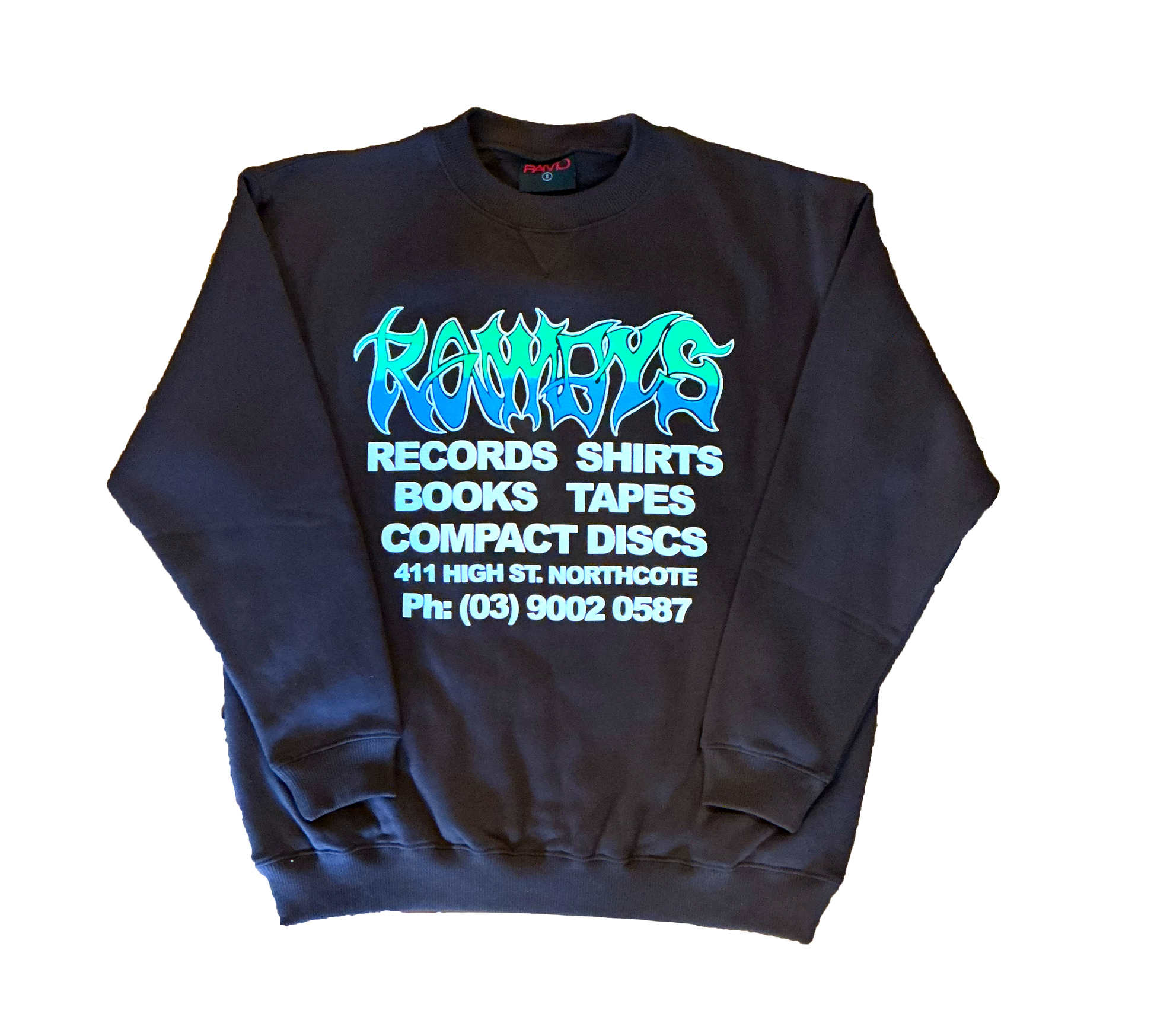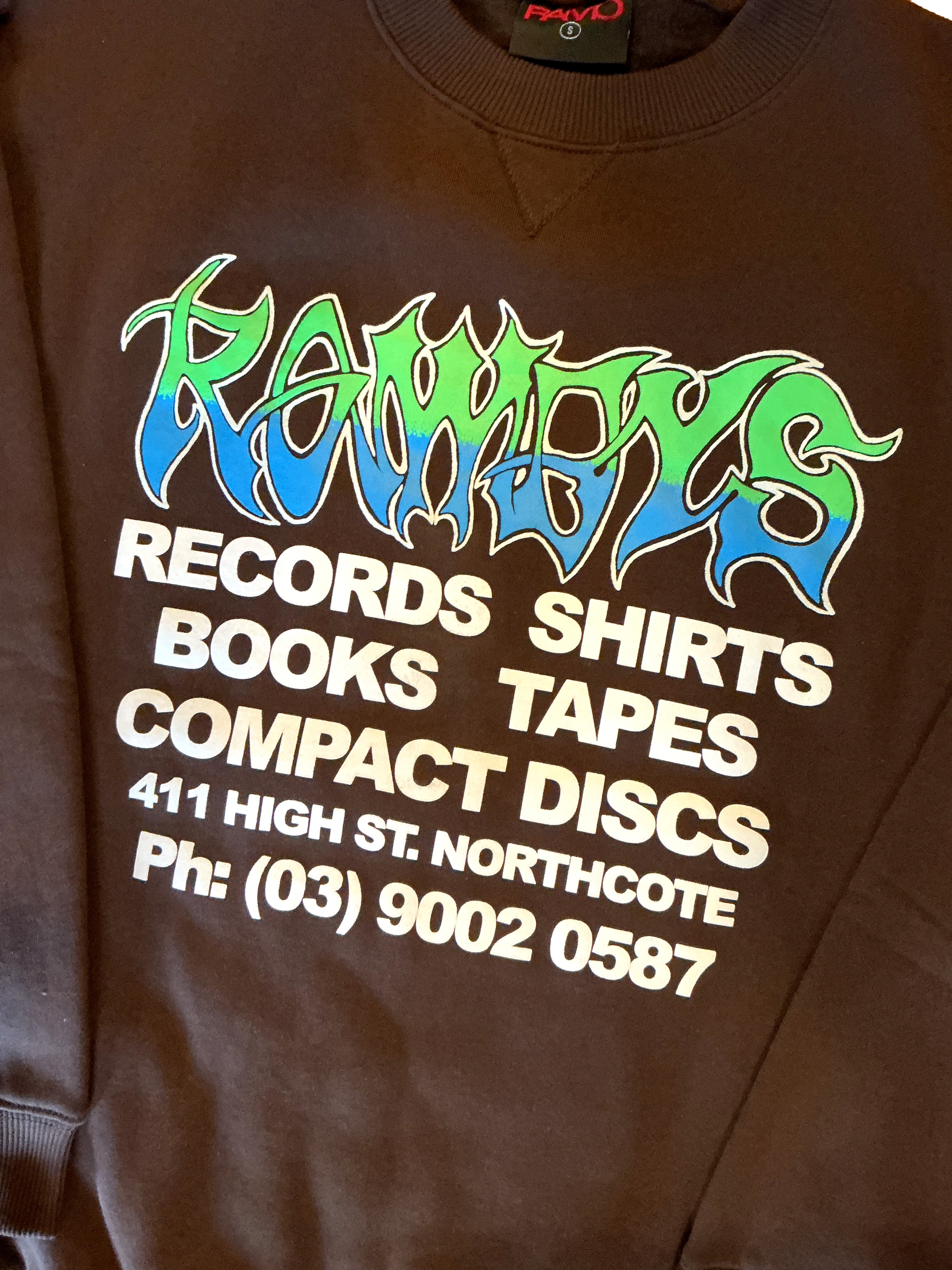 Screen printed on brown Ramo crew jumpers.
